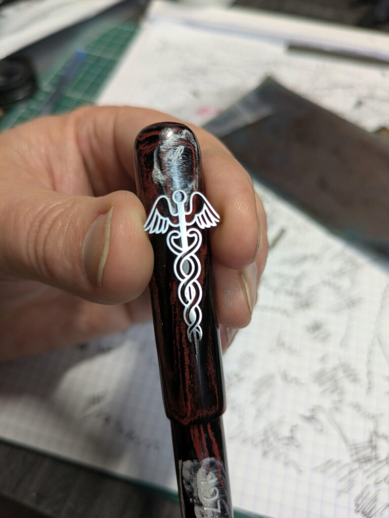 J’ai voulu garder trace de son travail dont il m’a tenu informé selon sa progression. J’ai ainsi vu naître cet instrument d’écriture unique que j’ai voulu comme symbole de toutes mes années de pratique, avec ce caducée qu’il a trouvé et ces dates gravées de toute une vie de pratique 1974-2025.