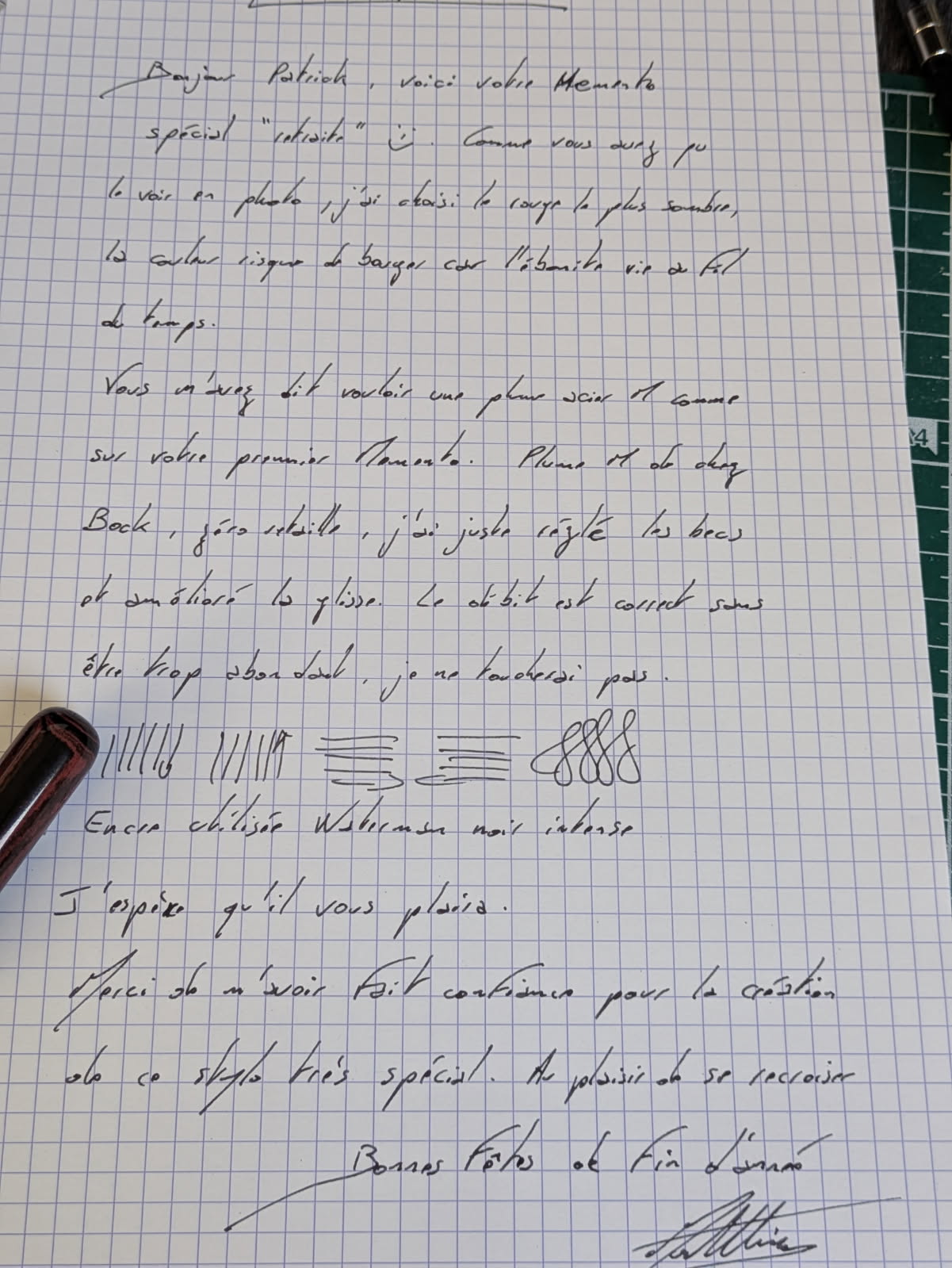J’ai voulu garder trace de son travail dont il m’a tenu informé selon sa progression. J’ai ainsi vu naître cet instrument d’écriture unique que j’ai voulu comme symbole de toutes mes années de pratique, avec ce caducée qu’il a trouvé et ces dates gravées de toute une vie de pratique 1974-2025.